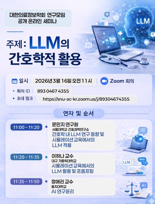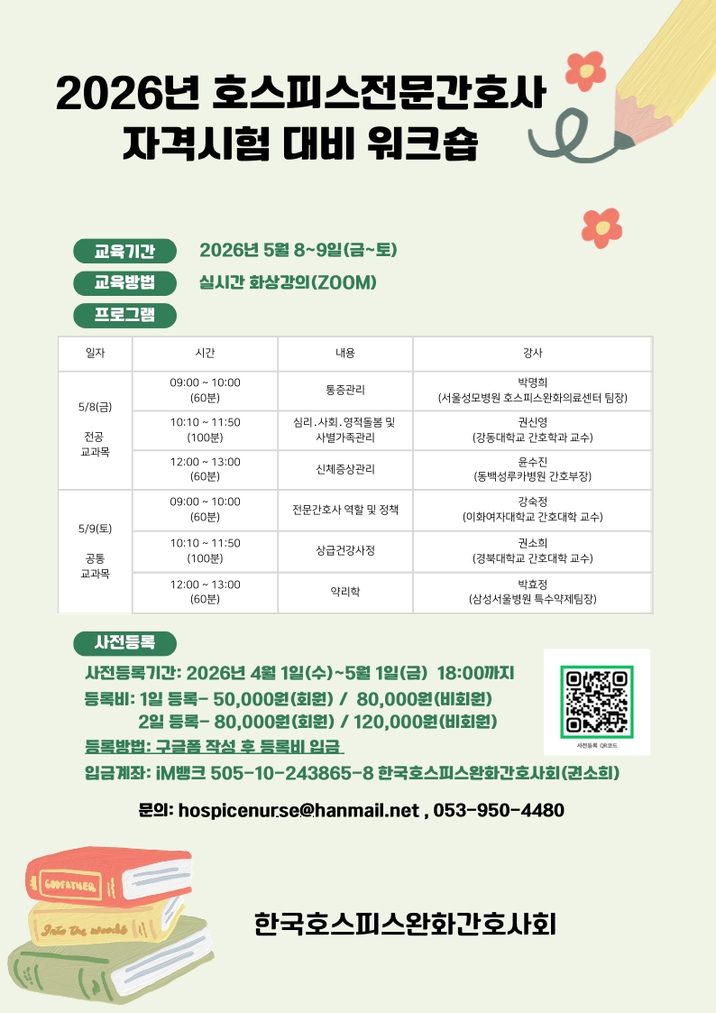 워크숍2026년도 호스피스전문간호사 자격시험 대비 워크숍 개최주최 한국호스피스완화간호사회일시 2026년 5월 8일 ~ 2026년 5월 9일모집2026년 4월 1일 ~ 2026년 5월 2일